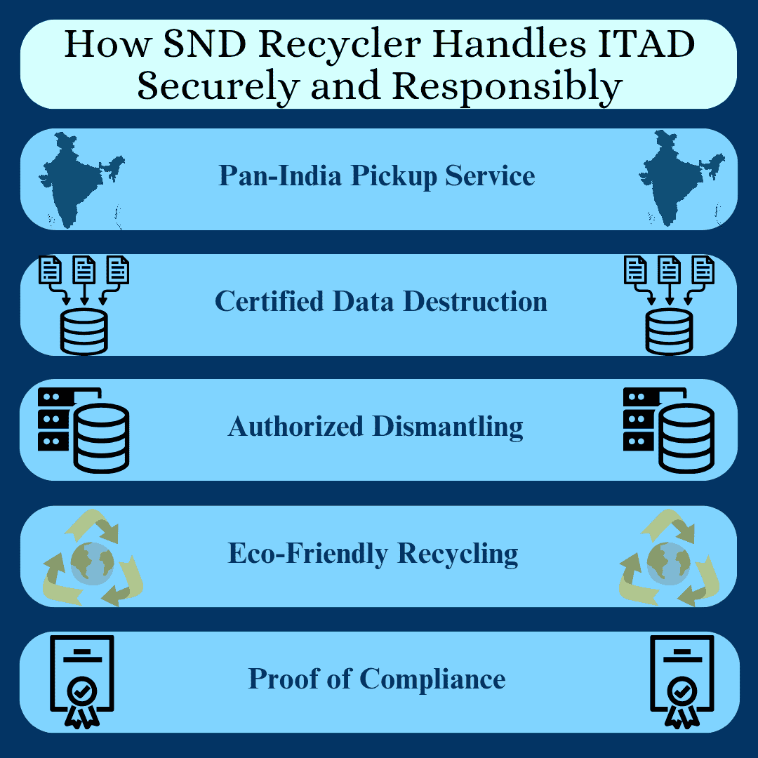 SND Recycler offers certified IT Asset Disposal services across India. Ensure secure data destruction, eco-friendly recycling, and complete compliance for your organization’s old IT assets.