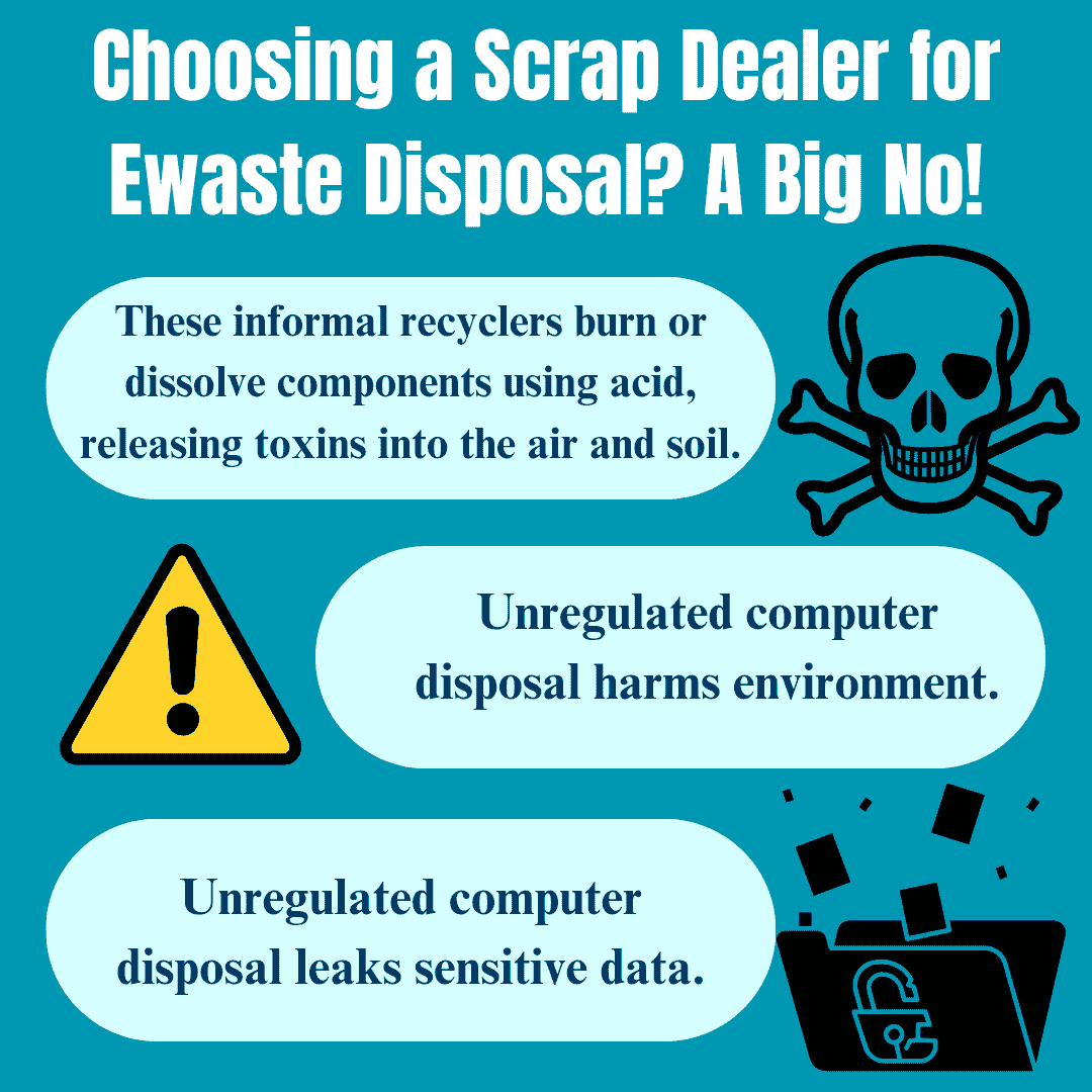 Many people hand their old computers to local scrap collectors, thinking it’s a harmless shortcut. But most of these informal recyclers burn or dissolve components using acid, releasing toxins into the air and soil.