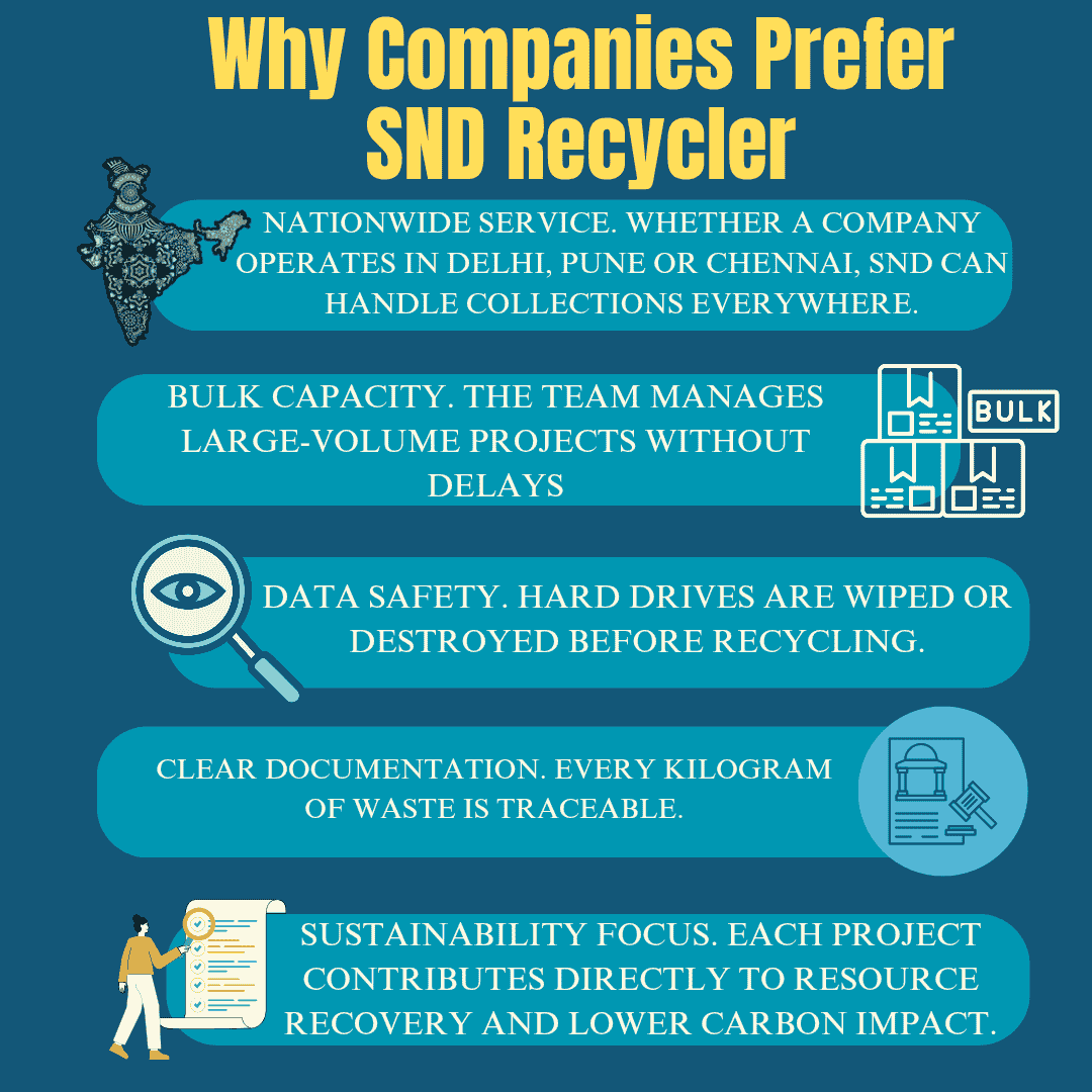 That is why certified e waste recyclers India matter so much. They follow safe, science-based methods. They recover valuable materials and stop hazardous waste from reaching the environment. SND Recycler does exactly that, combining experience, logistics and compliance to make recycling practical for large organisations.