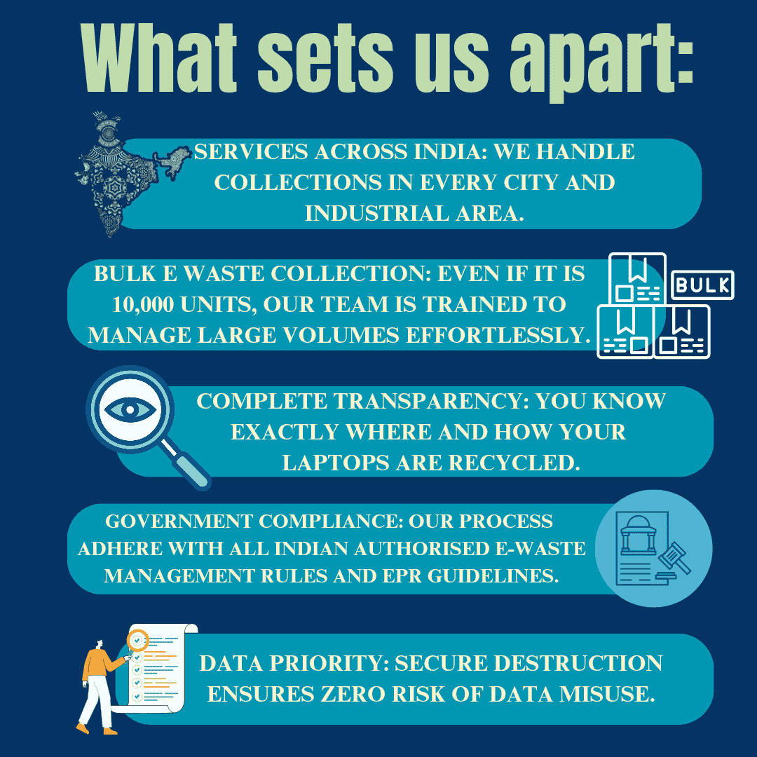 - Fast Collection Service: Our doorstep pickup services are available pan-India. Whether it’s for a corporate office, a school, or a warehouse full of retired laptops, our team handles logistics smartly.